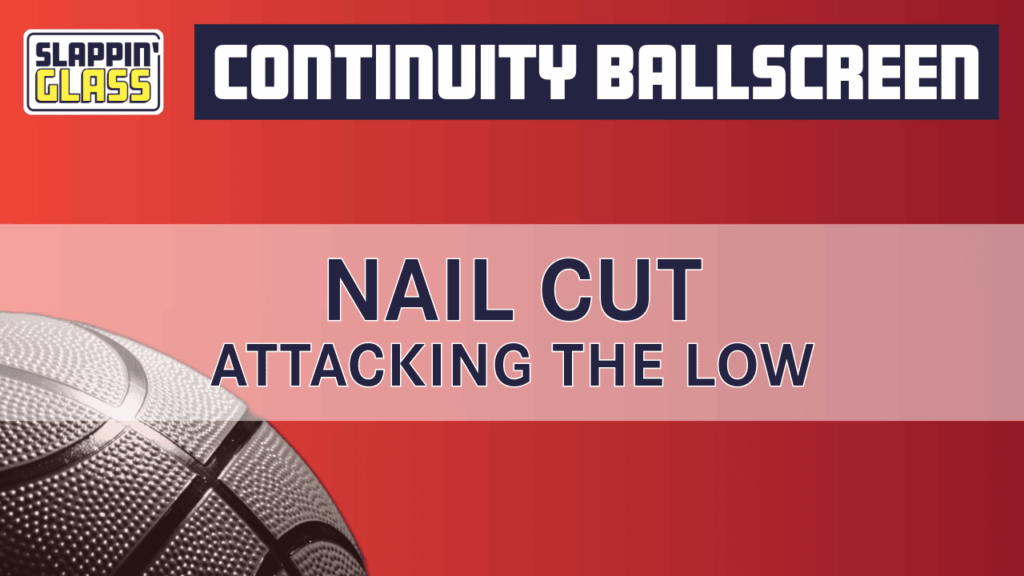 While the rip attack punishes the low man’s closeout, the nail cut continues to work beyond the initial rip look to create downhill advantages. By forcing the long corner closeout the offense creates an easier, deeper catch for the empty-side ballscreen, increasing separation from the next nearest defender and opening space to attack through the elbow.